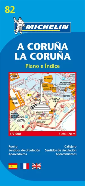 Encuentre todas las informaciones prácticas para recorrer A Coruña a pie, en coche o en bicicleta. El plano MICHELIN A Coruña, a escala 1/7 000 (1cm = 70m), es ideal para recorrer los barrios de la ciudad. Para completar la información incluye: transportes, sentidos de circulación, parkings... y un anexo con el índice de todas las calles.