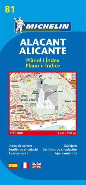 Encuentre todas las informaciones prácticas para recorrer Alicante a pie, en coche o en bicicleta. El plano MICHELIN Alicante, a escala 1/10 000 (1cm = 100m), es ideal para recorrer los barrios de la ciudad. Para completar la información incluye transportes, sentidos de circulación, localización de monumentos, así como un anexo con el índice de calles.